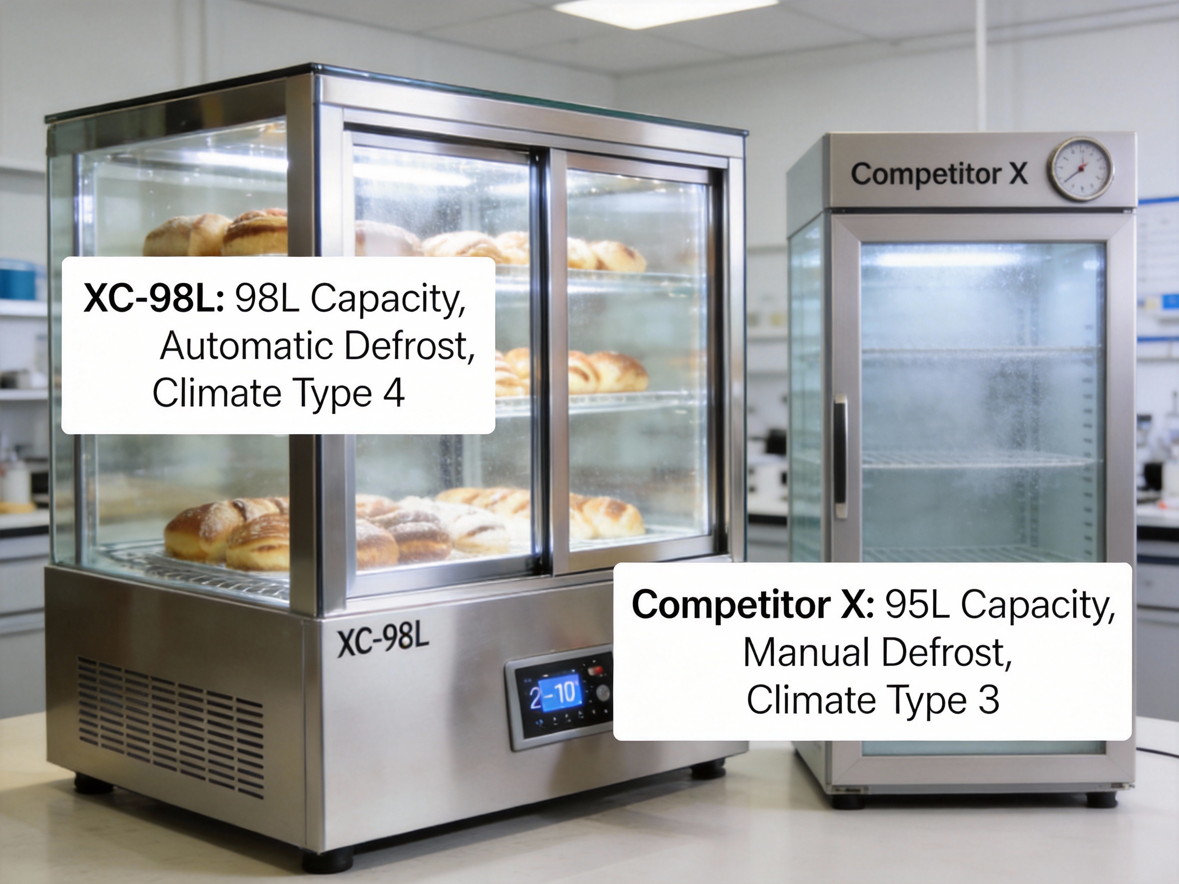 Another design advantage is the unit’s compact size (447*400*1119 mm). While it offers a generous 98L capacity, its slim profile makes it ideal for small to medium-sized businesses where floor space is at a premium. Competitors often offer larger units with similar capacity but bulkier dimensions, which can limit placement options. The XC-98L’s space-efficient design allows it to fit seamlessly in cafes, bakeries, or convenience stores without compromising on display area.