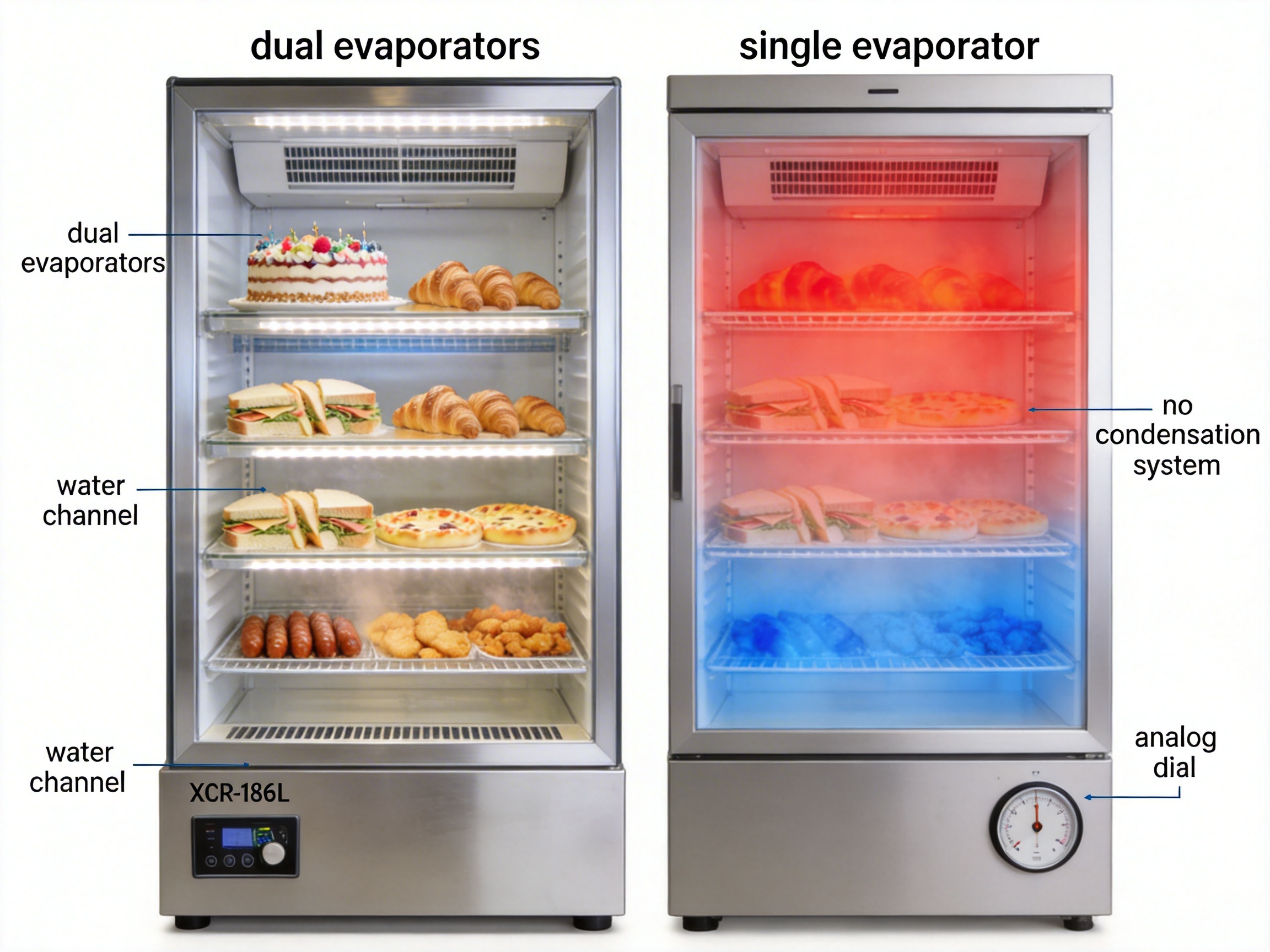 | Condensation Control | Water channel under top evaporator | No dedicated system | Prevents condensation dripping onto food; maintains dry, fresh presentation for cakes and pastries |