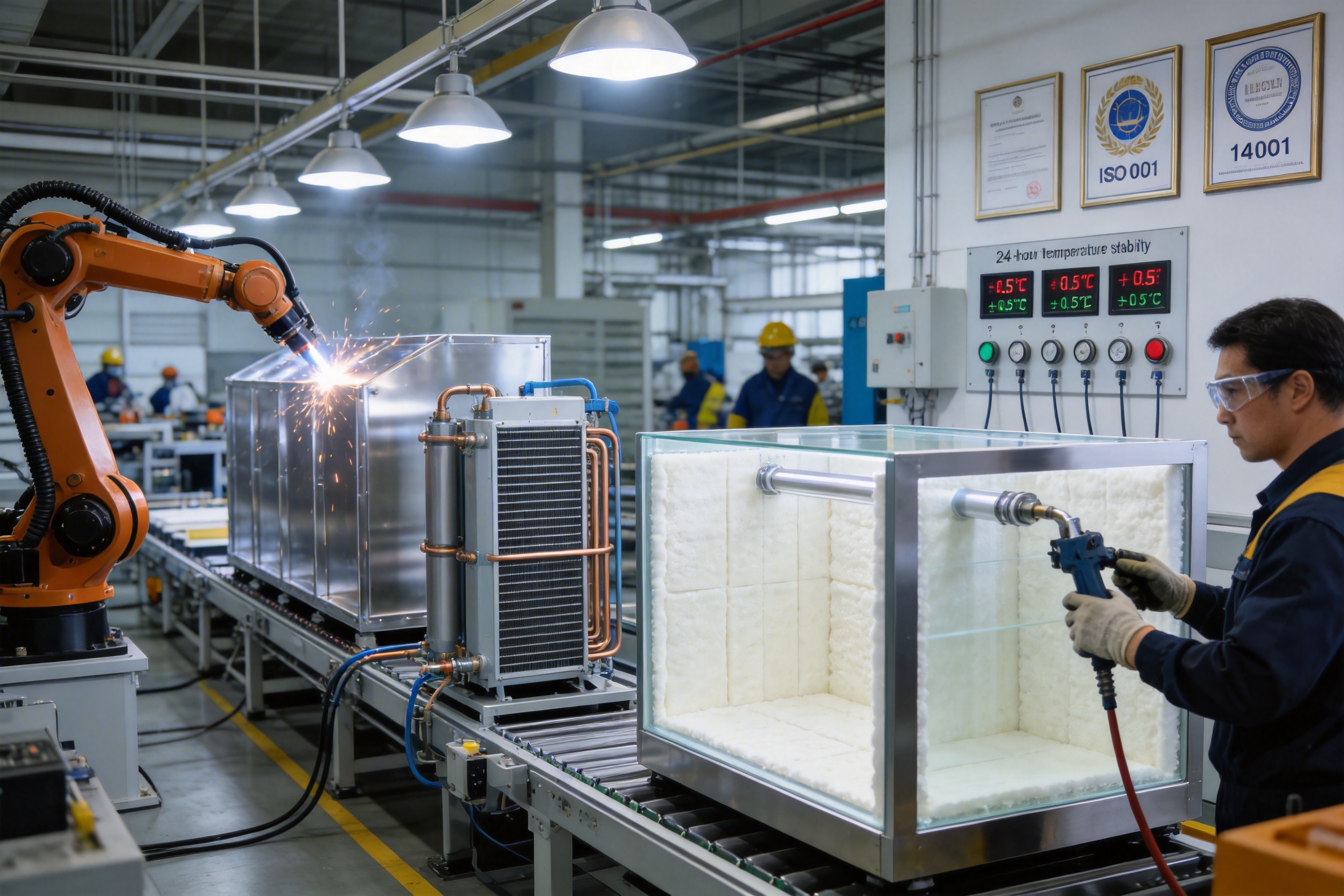 The factory’s production lines are fully automated, with robotic arms handling metal cutting, welding, and insulation assembly. This reduces human error and ensures consistency across every unit. Key production processes include: