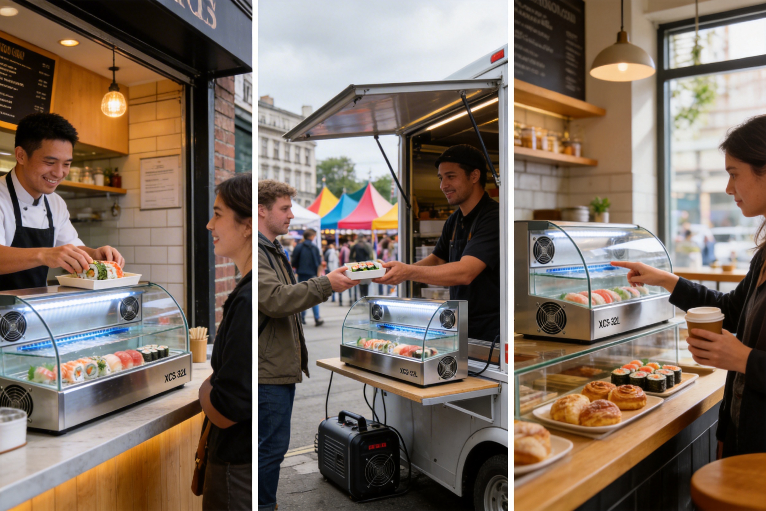 Now, let’s visualize the XCS-52L in action. Its compact countertop design fits seamlessly into any food service setup, while the clear tempered glass ensures 360-degree visibility of displayed sushi.