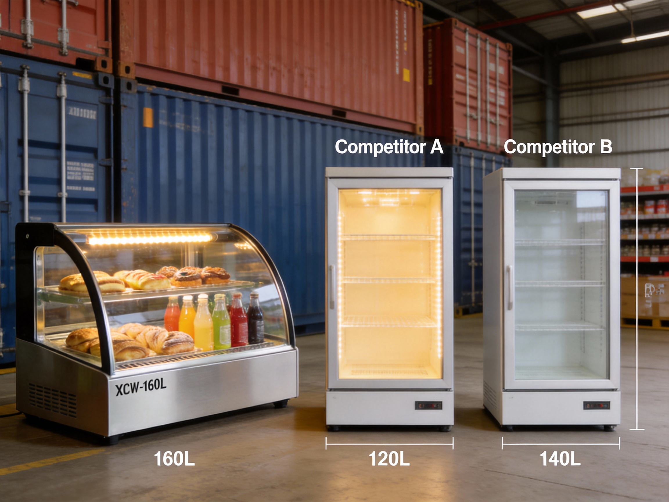 Capacity: 160 Liters (Net) – The 160L net capacity is a standout feature for a countertop unit. Most competitors offer 120-140L, meaning the XCW-160L can hold up to 20% more products without increasing its footprint. This is critical for businesses during peak hours, as it reduces the need for frequent restocking and ensures you always have popular items in stock.